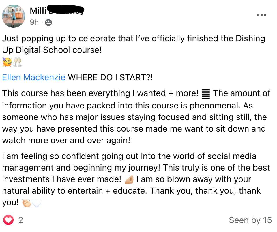 - Access to Ellen’s educational vault: all courses and digital products during your mastermind container (including the Dishing up Digital School)Â